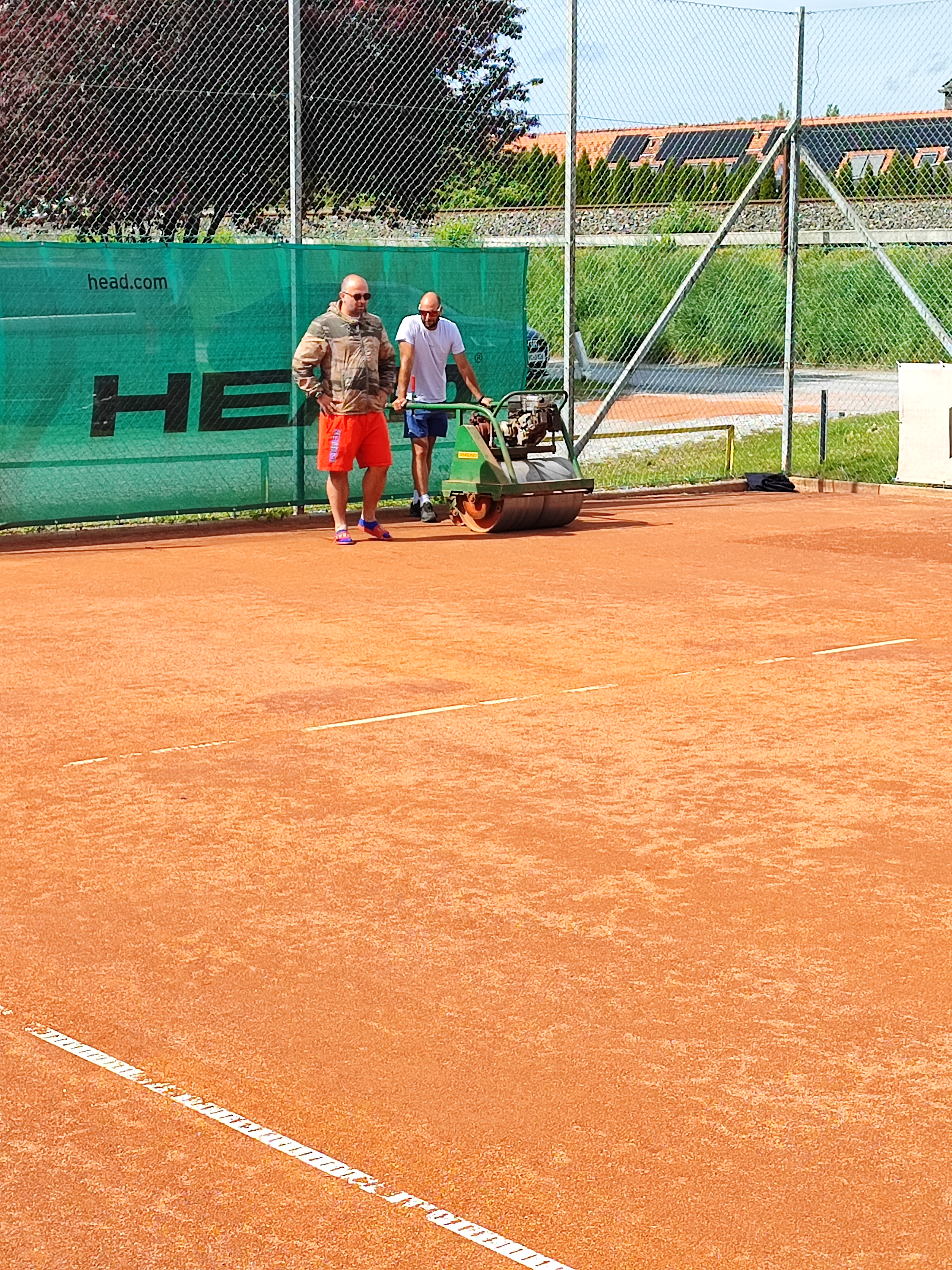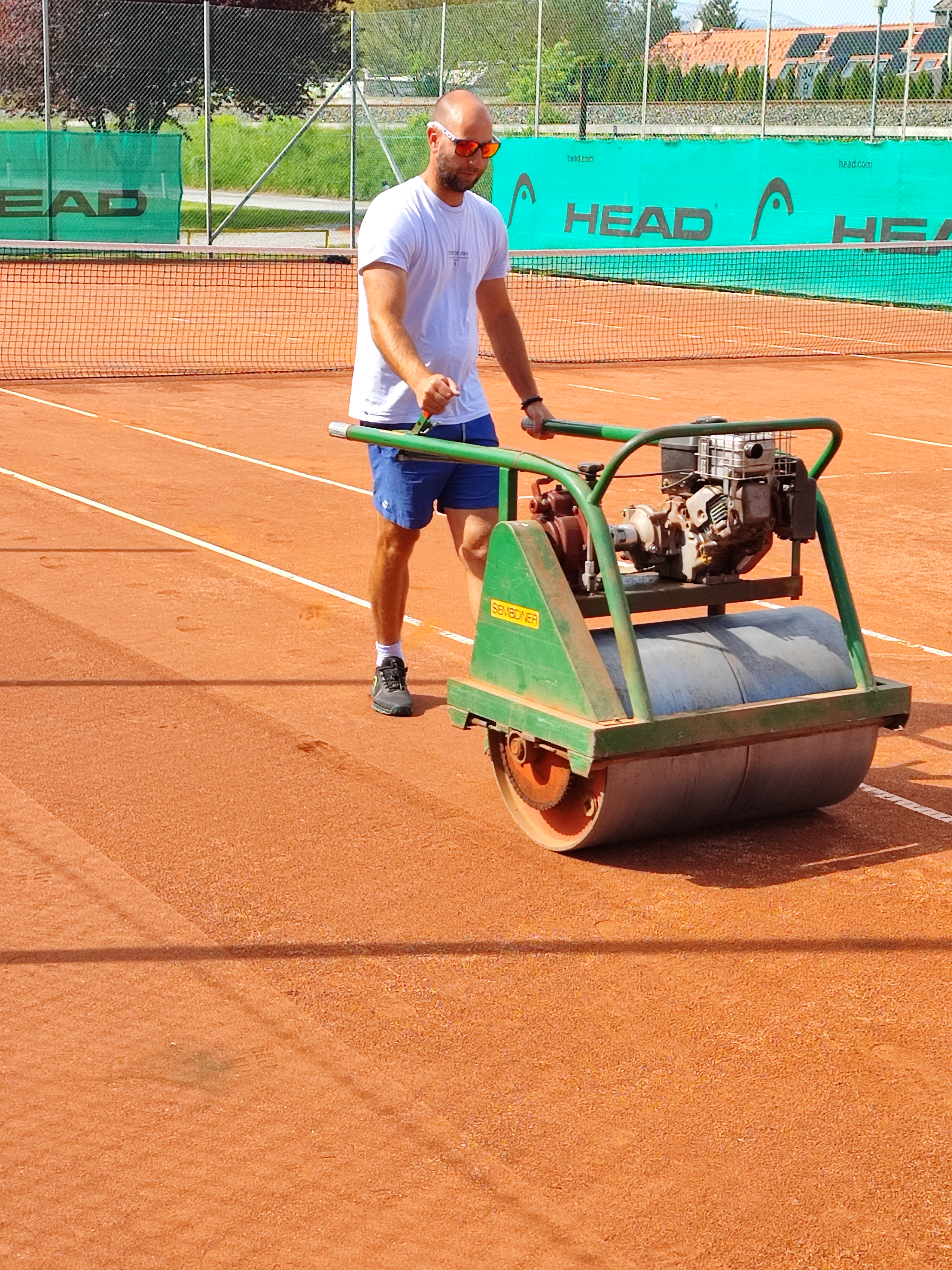 Nach seinem Arbeitseinsatz heute, wird Petar die Plätze morgen am Vormittag nochmals walzen. Ab 12 Uhr kann dann gespielt werden. Bitte verwendet Schuhe, die für Sandplätze geeignet sind. Sollten Löcher entstehen, schließt sie bitte. Wenn wir uns gemeinsam ein wenig um die Plätze kümmern, werden wir die ganze Saison tolle Verhältnisse haben.